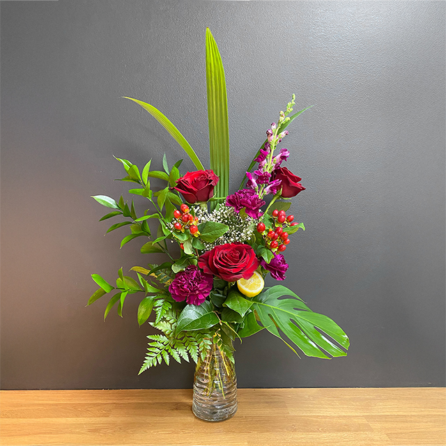 Bouquet la vie en rouge vase inclus; ajoutez des macarons ou du Chocolats Favoris, augmentez sa valeur et une carte ! Il se compose de mini-callas, oeillet, mufflier, alstroemeria, roses, monstera, tous des végétaux de première qualité Éco. (Voir l'entretien de vos fleurs.)