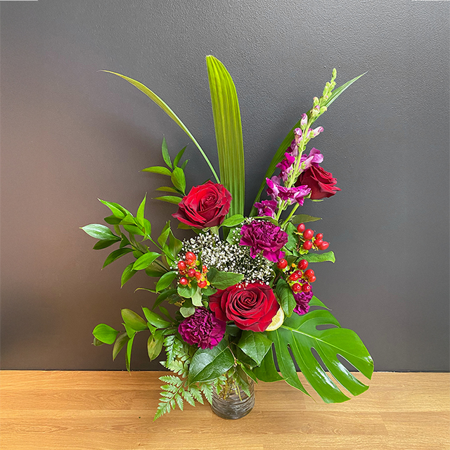 Bouquet la vie en rouge vase inclus;augmentez sa valeur et une carte ! Il se compose de mini-callas, oeillet, mufflier, alstroemeria, roses, monstera, tous des végétaux de première qualité Éco. (Voir l’entretien de vos fleurs.) Complétez avec des produits Chocolats Favoris
