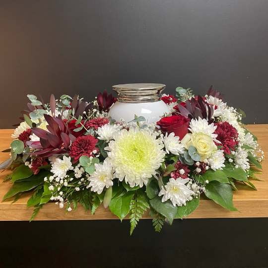 Couronne sur table une urne funéraire.